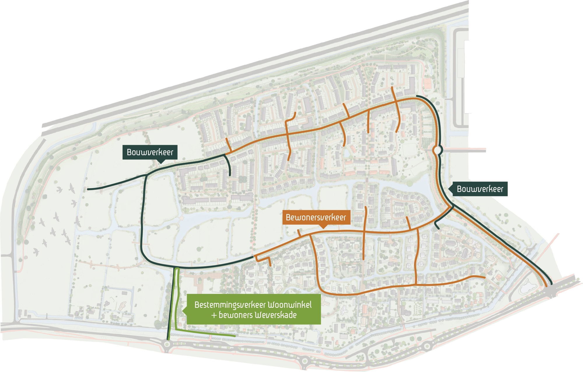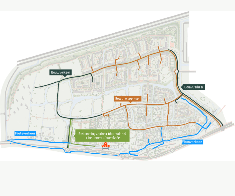 - Bewoners en hun bezoek kunnen het woongebied bereiken via de fietspaden langs de Weverskade (vanaf Weverskade 93) en het fietspad langs de entree aan de Cornelis van der Lelylaan.